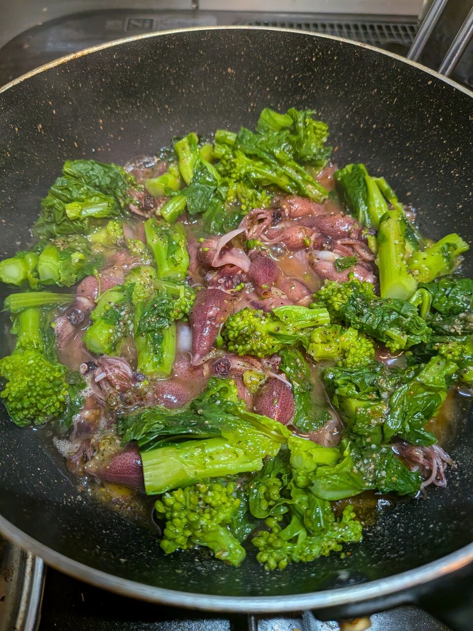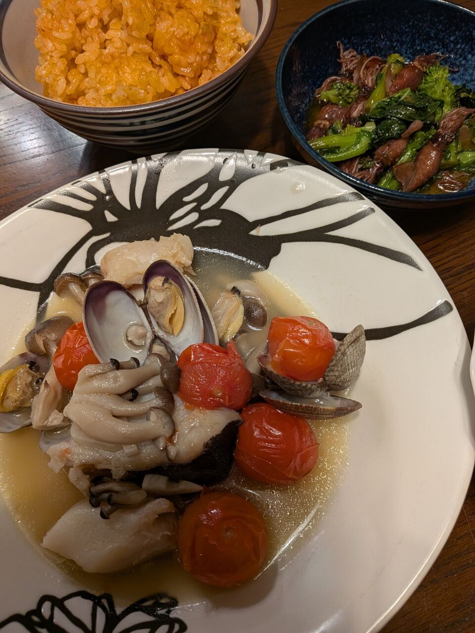 夕飯は、タラのアクアパッツアとホタルイカのアヒージョを作りました。