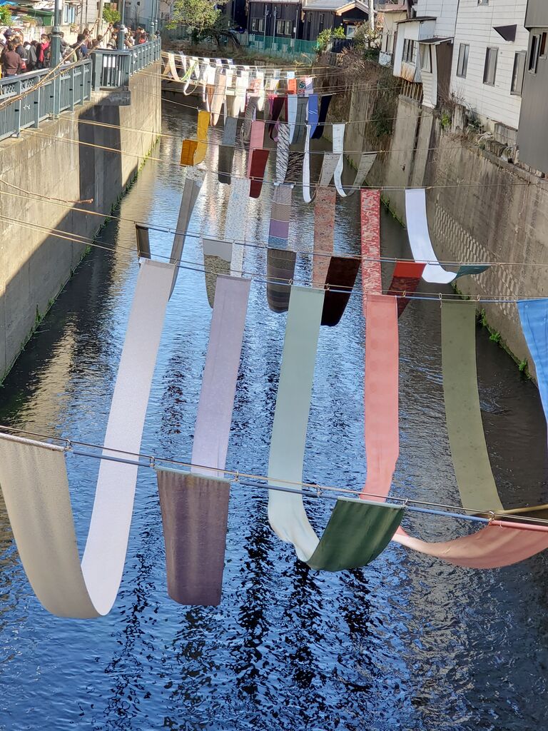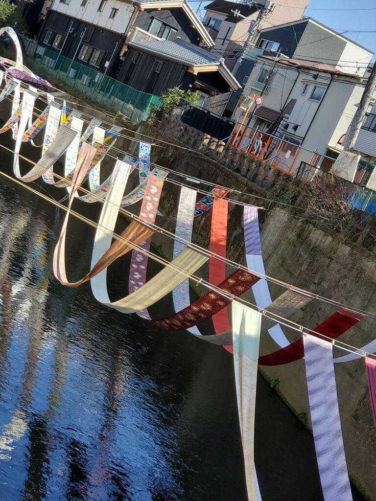 今なお活動を続ける職人さんたちと地元の商店街が川に染め物をかけ渡します。