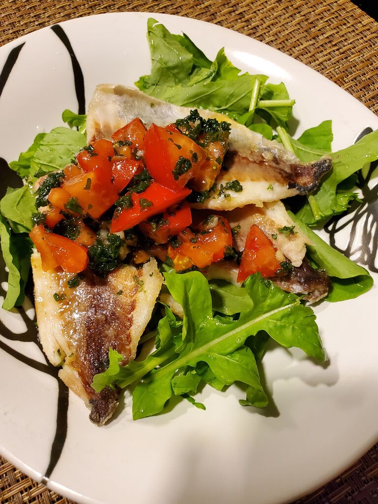 ルッコラには鯵のソテーを乗せてトマトのドレッシングで。