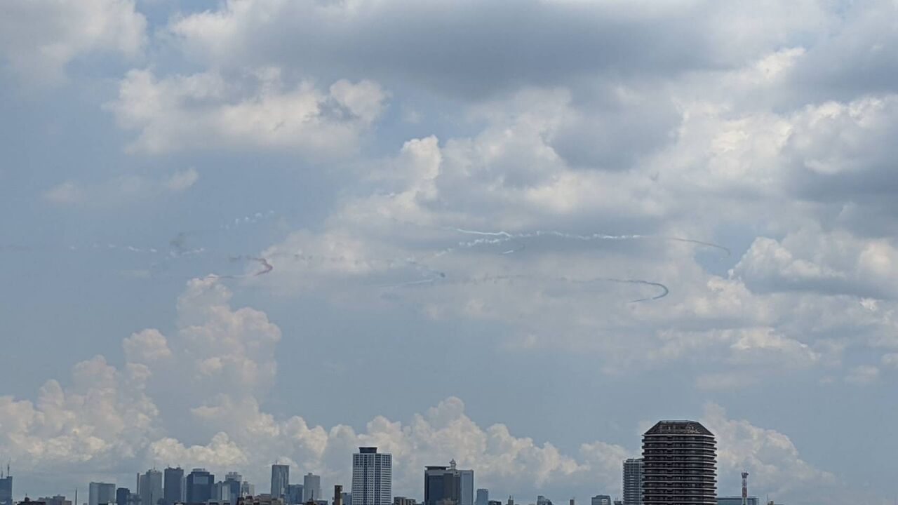 今日は上空をブルーインパルスが飛んで五色のスモークで空に五輪マークを描きました。