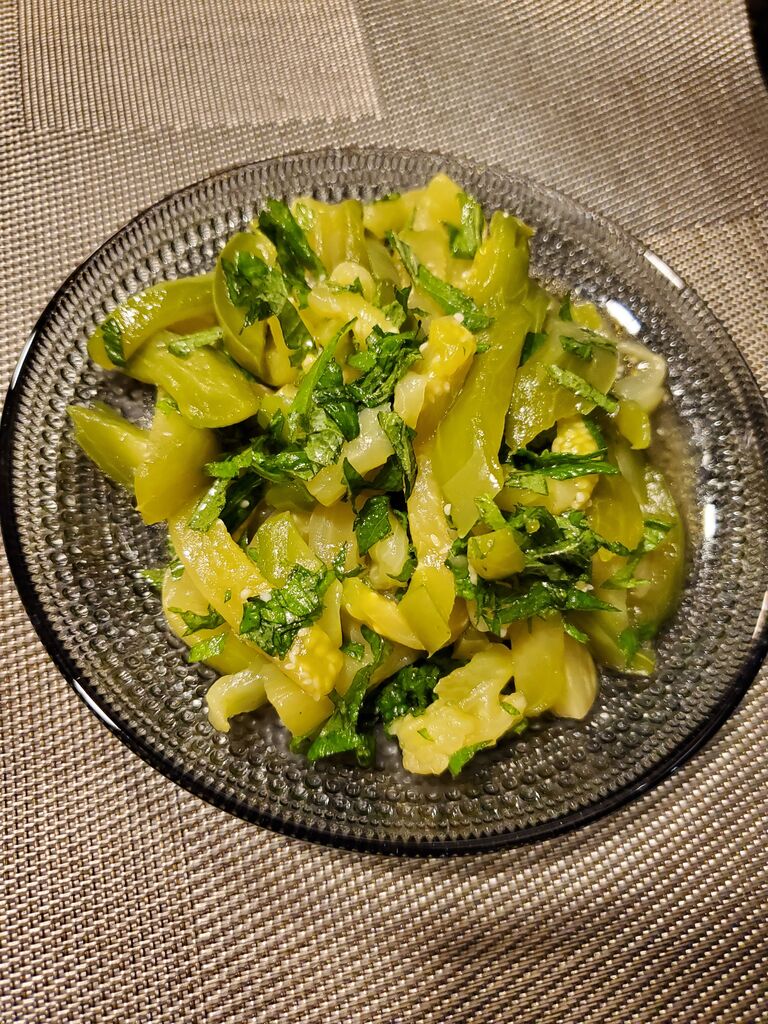 青ナスを細く切って茹でて茄子素麺にして青じそドレッシングでいただきました。