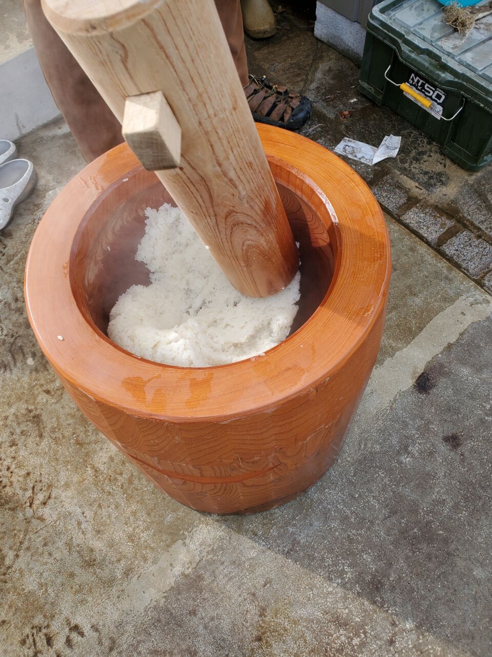 蒸しあがったほかほかのお米を臼にいれて杵でつきます。