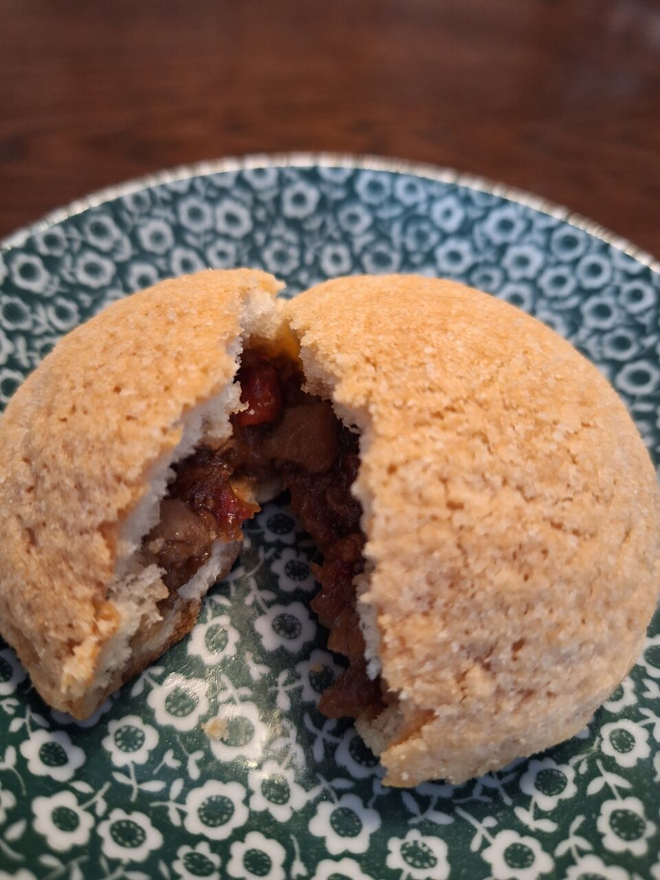 甘いメロンパンのようなパオズのなかに甘いシャーシューの餡がとろりと入っています。