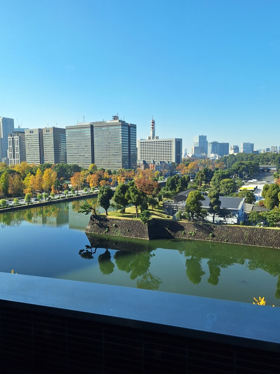 美術館のロビーから見える皇居お濠端の景色が美しい。