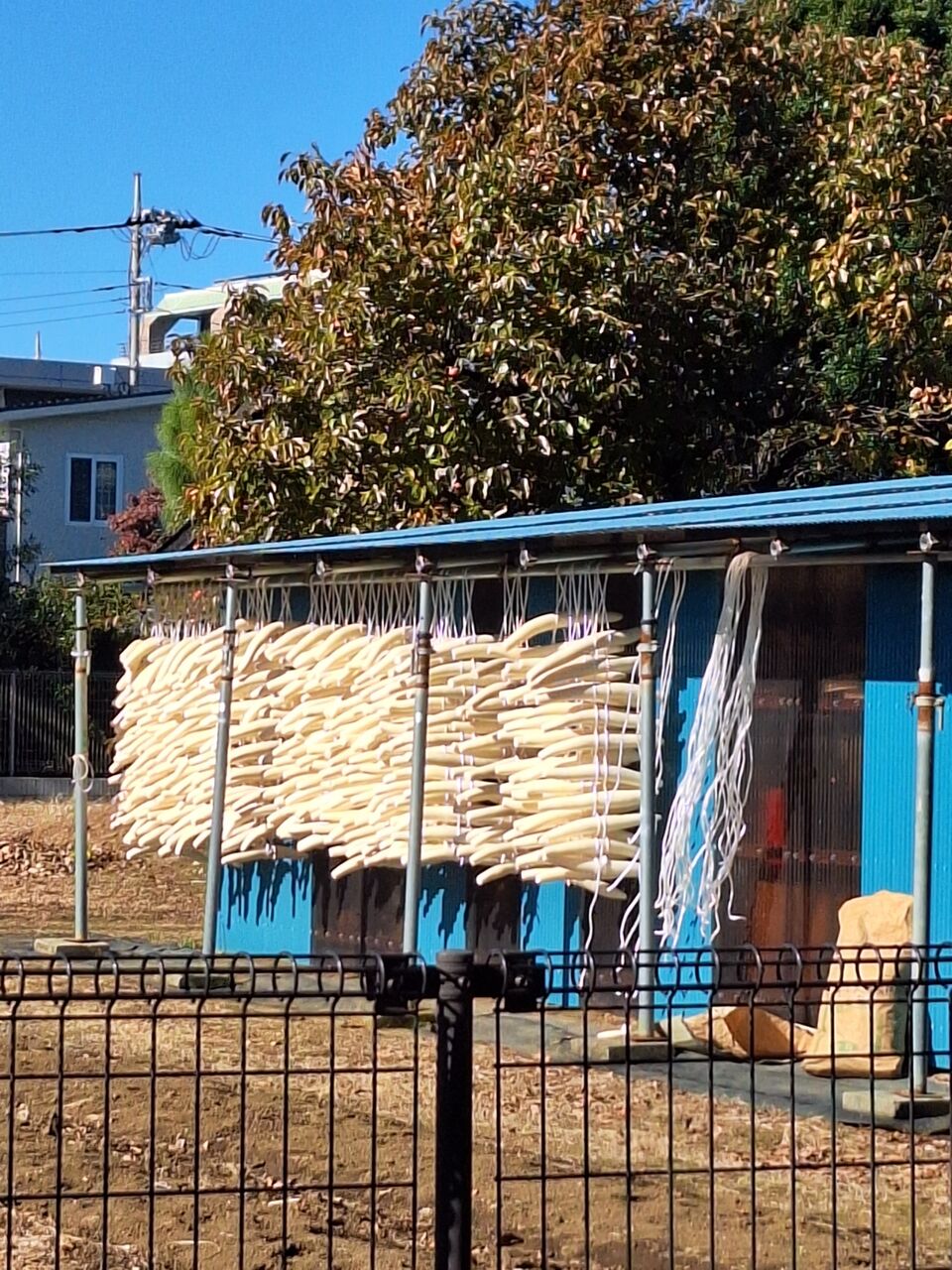 近所の畑には大根がたくさん干してあります。