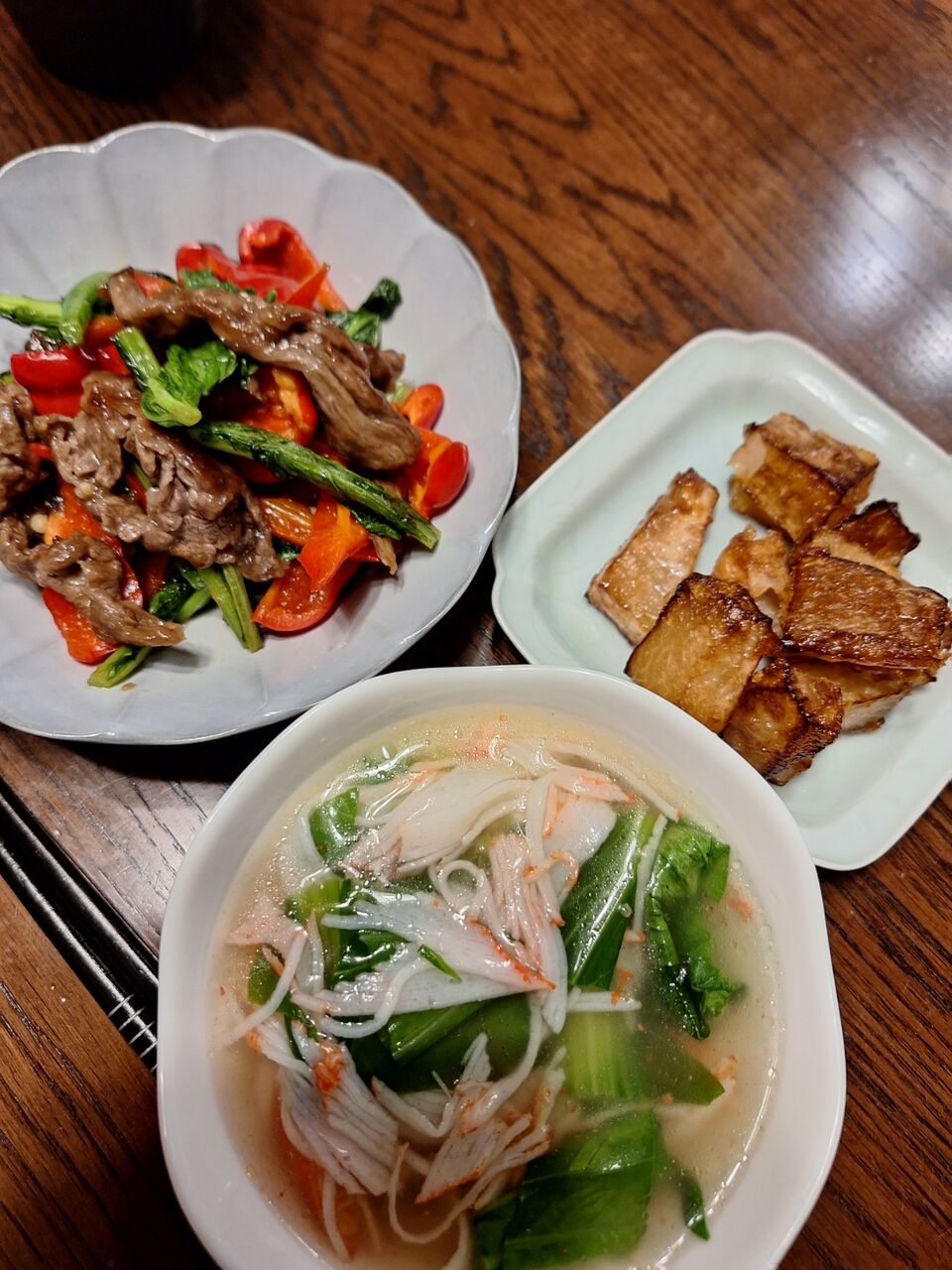 小松菜と牛肉のオイスター炒め、青梗菜とカニカマのスープ。