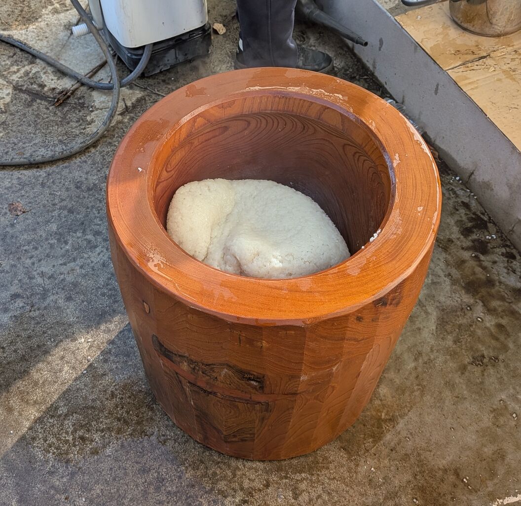 やっと蒸しあがったもち米を木の臼に投入。