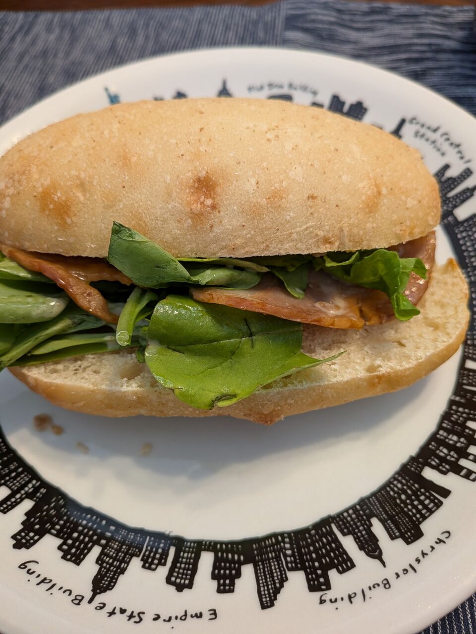 チャパタは翌日のお昼にリベイクしてルッコラとチャーシューをいれたサンドイッチに。
