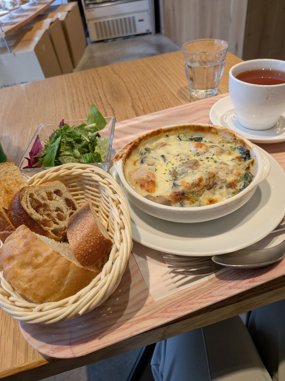 あつあつの牡蠣のグラタンにサラダとパンが数種類ついています。